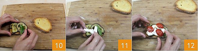 Il ne vous reste maintenant plus qu'à garnir les tranches de pain grillé. Disposez les tranches de pain sur une planche à découper et formez une couche d'aubergines 10, puis placez un morceau de burrata 11 et ajoutez les tomates cerises 12. Vos bruschettas aux aubergines, burrata et tomates cerises sont prêtes à être dégustées !