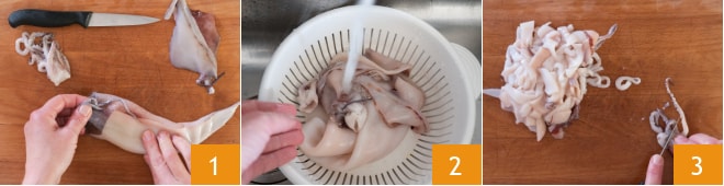 Pour réaliser les trofie au four avec calamars et chou-fleur, commencez par préparer tous les ingrédients. Pour nettoyer les calamars, commencez par détacher délicatement la tête du manteau, puis retirez la peau et extrayez la plume de cartilage qui se trouve à l'intérieur 1. Rincez les calamars nettoyés sous l'eau courante 2, puis coupez le manteau et les tentacules en petits morceaux 3. Pour plus d'informations sur le procédé, vous pouvez consulter notre fiche sur le nettoyage des calamars.