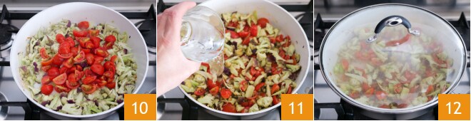 Ajoutez également les tomates 10, salez, poivrez et versez l'eau 11, puis baissez le feu, couvrez avec un couvercle 12 et faites cuire pendant environ 20 minutes.
