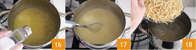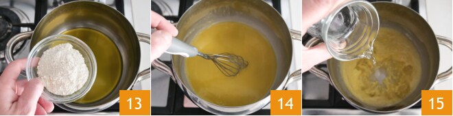 En attendant, portez à ébullition une casserole d'eau pour la cuisson des pâtes et préparez la béchamel à l'eau : versez la farine et l'huile dans une petite casserole 13 et mélangez avec un fouet à feu doux pendant quelques minutes 14, puis éteignez le feu et versez l'eau 15.
