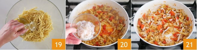 Après avoir égoutté les trofie, versez-les dans un grand bol et assaisonnez avec un filet d'huile pour éviter qu'elles ne collent 19. Lorsque les 20 minutes de cuisson de l'assaisonnement sont écoulées, ajoutez les calamars 20 et faites cuire pendant encore 5-7 minutes 21.