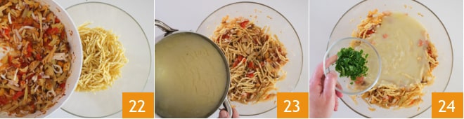 Versez l'assaisonnement dans le bol avec les pâtes 22 ainsi que la béchamel 23 et le persil haché 24, puis mélangez bien pour amalgamer le tout.