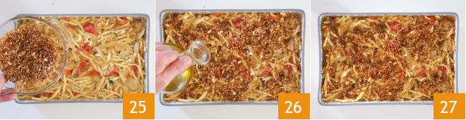 Transférez les pâtes ainsi assaisonnées dans un plat allant au four et saupoudrez de chapelure sur le dessus 25, puis assaisonnez avec un filet d'huile 26. Faites cuire dans un four ventilé préchauffé à 200° environ 10 minutes, jusqu'à ce que le dessus soit bien doré. Sortez vos trofie au four avec calamars et chou-fleur et servez 27 !