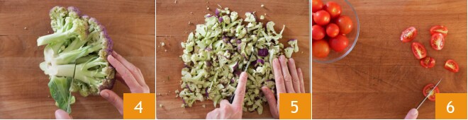 Enlevez la base et les feuilles du chou-fleur, puis détachez les fleurettes (vous devez obtenir environ 500 g utilisables) 4 et coupez-les également en petits morceaux 5. Coupez les tomates cerises en quartiers 6.