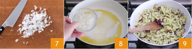 Enfin, hachez finement l'oignon 7. Maintenant, chauffez un filet d'huile dans une grande poêle et faites revenir brièvement l'oignon 8, puis ajoutez le chou-fleur et laissez-le s'imprégner pendant quelques minutes 9.