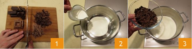 Pour préparer les truffes au chocolat, commencez par la Crème ganache. Avec un couteau, hachez le chocolat noir et le chocolat au lait 1. Placez sur le feu une grande casserole avec la crème 2; quand la crème arrive à ébullition, retirez-la du feu et versez le chocolat noir 3.
