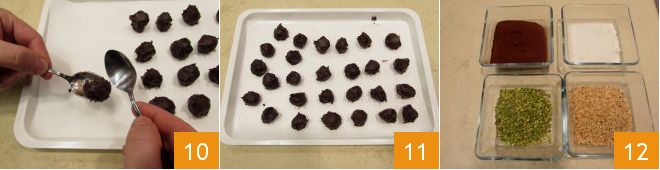 Commencez ensuite à composer vos truffes: prélevez des petites portions de mélange au chocolat (environ 12-15 gr) et à l’aide de 2 cuillères (ou avec les mains, en n’oubliant pas de les humidifier avant de procéder) formez des petites boules 10. Au fur et à mesure que vous les travaillez, disposez les truffes sur un plateau recouvert d’une feuille de papier sulfurisé que vous placerez au réfrigérateur pendant au moins 30 minutes: avec nos doses, vous devriez obtenir 40 truffes 11. Une fois le temps écoulé, placez les noisettes et les pistaches concassées, la noix de coco râpée et le cacao en poudre dans 4 petits bols pour réaliser le nappage 12.