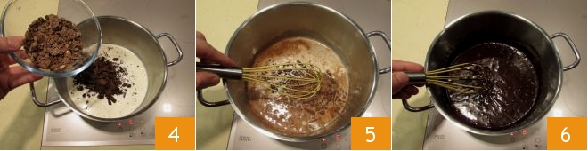À ce stade, ajoutez le chocolat au lait, précédemment haché 4. Mélangez avec les fouets 5 et faites fondre le tout complètement. Continuez à mélanger jusqu'à obtenir un mélange crémeux et sans grumeaux 6.