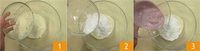 Pour réaliser les truffes au yaourt, versez la farine d'amande dans un bol 1, puis ajoutez le sucre glace 2 et le yaourt aux fruits rouges 3.