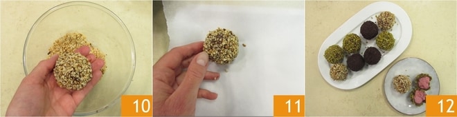 Après l'avoir complètement enrobée 10, déposez-la sur une feuille de papier sulfurisé 11 et procédez de cette manière avec toutes les autres truffes, en alternant la couverture de noisettes avec celle de pistaches et avec les vermicelles. Vos truffes au yaourt sont prêtes à être servies 12 !