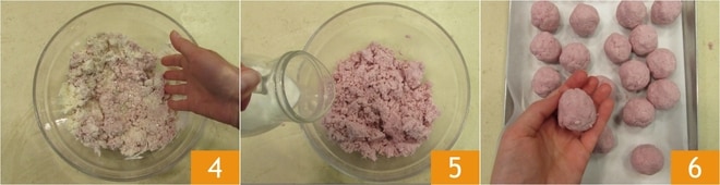 Mélangez les ingrédients avec une cuillère ou avec les mains 4, puis ajoutez la crème 5 et pétrissez le tout jusqu'à obtenir un mélange homogène. Formez des boules d'environ 25 g chacune 6; avec ces quantités, vous obtiendrez environ 24 pièces.