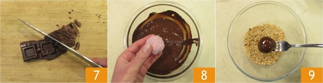 Maintenant, hachez le chocolat noir 7 et faites-le fondre au bain-marie ou au micro-ondes. Versez les fruits secs hachés et les vermicelles dans des bols différents. Plongez une boule à la fois dans le chocolat fondu 8, puis passez-la dans les fruits secs 9.