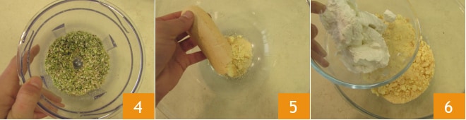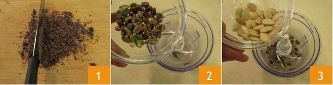 Pour réaliser les truffes sans gluten à la ricotta et au chocolat, commencez par hacher finement le chocolat noir avec un couteau 1. Dans un mixer, mettez les pistaches 2 et les amandes 3.