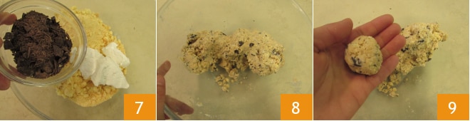 Incorporez également le chocolat 7 et mélangez le tout avec les mains jusqu'à obtenir une pâte homogène et compacte 8. Formez des boules d'environ 20 grammes chacune 9, avec ces quantités, vous obtiendrez environ 18 truffes.