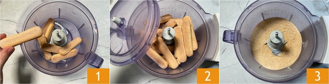 Pour préparer les truffes tiramisu, commencez par préparer le café et laissez-le refroidir jusqu'à ce qu'il soit à température ambiante. Placez les boudoirs dans le bol d'un mixeur équipé de lames 1, fermez le couvercle 2 et mixez-les jusqu'à ce qu'ils soient réduits en poudre 3.