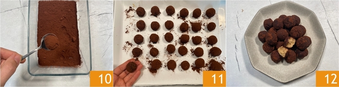 Roulez-la dans le cacao, en la recouvrant bien de tous les côtés 10 et continuez ainsi jusqu'à épuisement de la pâte; avec ces quantités, vous obtiendrez environ 30 truffes. Disposez-les au fur et à mesure sur un plateau 11 et placez-les au réfrigérateur pendant au moins une heure (ou au congélateur pendant 20 minutes) avant de les servir. Vos truffes tiramisu sont prêtes à être dégustées 12!
