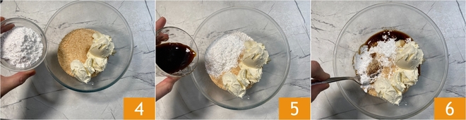 Transférez la poudre de biscuits dans un bol, puis ajoutez le mascarpone, le sucre glace 4 et le café 5. Mélangez avec une cuillère 6.