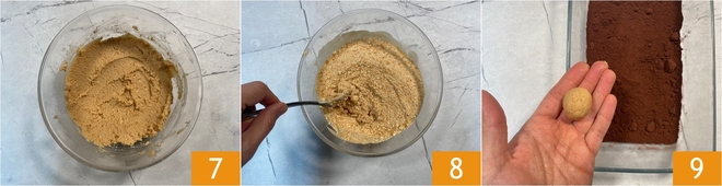 Vous devez obtenir un mélange homogène 8. À ce stade, prélevez une cuillère à café de pâte, environ 15 g 7, et formez une boule 9.