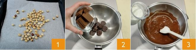 Pour préparer les truffes, commencez par griller les noisettes sur une plaque recouverte de papier sulfurisé 1, dans un four statique préchauffé à 150° pendant 30 minutes (130° pendant 20 minutes si four ventilé). Pendant ce temps, faites fondre le chocolat noir et gianduja au bain-marie 2, en remuant avec une cuillère en bois (l'eau dans la casserole ne doit pas toucher le récipient où vous faites fondre le chocolat). Une fois qu'il est complètement fondu, versez également la crème fraîche liquide 3 et continuez à mélanger.