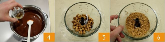 Ajoutez la liqueur Grand Marnier 4, mélangez à nouveau, jusqu'à obtenir un mélange crémeux, lisse et sans grumeaux. Ensuite, éteignez le feu et transférez le mélange dans un bol; pendant qu'il refroidit, prenez les noisettes, désormais grillées, et mettez-les dans un mixeur 5, pour les hacher finement 6.
