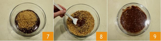 Ensuite, ajoutez-les au mélange de chocolat dans le bol 7 et mélangez avec une cuillère en bois pour amalgamer les ingrédients 8. Couvrez la pâte avec du film plastique 9 et laissez-la raffermir au réfrigérateur pendant 2-3 heures, jusqu'à ce qu'elle soit bien ferme et compacte.