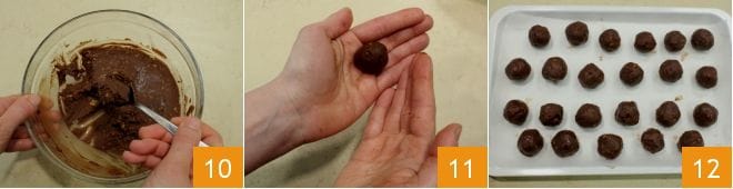 À ce stade, prélevez une cuillère à café de mélange à la fois (environ 10 g) 10; pour cette opération, vous pouvez également utiliser une cuillère à glace. Travaillez les boules avec les mains pour leur donner une forme plus régulière 11. Au fur et à mesure que vous les travaillez, disposez les boules sur un plateau 12, que vous mettrez ensuite au réfrigérateur pour raffermir au moins 1 heure.