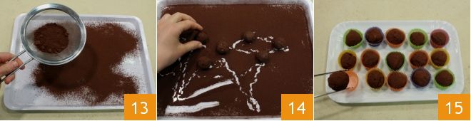 Ensuite, saupoudrez un plateau avec le cacao amer tamisé 13 et faites-y rouler les truffes 14 pour les recouvrir soigneusement. Servez les truffes à l'intérieur de petits moules en papier coloré 15!