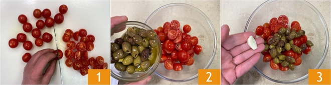 Pour préparer la truite saumonée à la poêle, commencez par les tomates cerises : coupez-les en deux 1 et mettez-les dans un bol avec les olives taggiasche 2. Assaisonnez avec du sel, de l'huile et une gousse d'ail 3, mélangez et mettez de côté pour le moment.