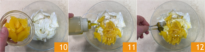 Mélangez le fenouil et les oranges dans un bol 10, puis assaisonnez avec du sel, du poivre et de l'huile 11. Mélangez délicatement 12.