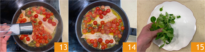 À ce stade, la truite sera cuite, ajustez le sel 13 et le poivre. Éteignez le feu et laissez reposer une minute avant de dresser 14. Répartissez la mâche à la base de l'assiette 15.