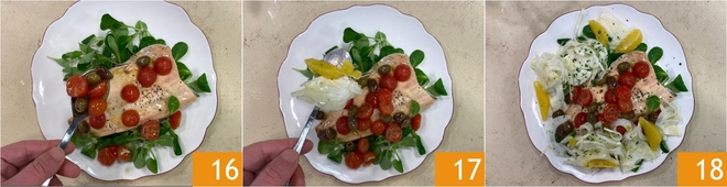 Déposez dessus un filet de truite avec sa sauce aux tomates cerises et olives 16, puis ajoutez à côté la salade d'oranges et de fenouil 17. Enfin, garnissez avec du persil haché. Votre truite saumonée à la poêle est prête à être servie 18 !