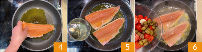Faites chauffer un filet d'huile dans une grande poêle anti-adhésive et déposez les filets de truite côté peau 4. Faites cuire à feu moyen pendant 2-3 minutes, puis augmentez légèrement le feu et déglacez avec le vin blanc 5. Lorsque l'alcool s'est complètement évaporé, ajoutez le mélange de tomates cerises et olives 6.