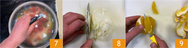 Couvrez avec un couvercle 7 et poursuivez la cuisson pendant 5-7 minutes supplémentaires, sans retourner les filets. Pendant ce temps, préparez la salade de fenouil et oranges : tranchez finement le fenouil 8, puis pelez les oranges à vif, c'est-à-dire retirez les segments en insérant un couteau bien aiguisé entre la pulpe et la membrane blanche qui les sépare 9.