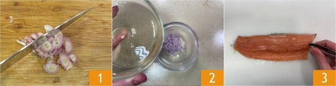 Pour préparer la truite saumonée en croûte de pistaches, nettoyez et hachez l'échalote 1, puis mettez-la à tremper dans un bol avec des quantités égales de vinaigre et d'eau 2, pour en adoucir le goût. Prenez les filets de truite nettoyés mais avec la peau, retirez les arêtes 3. Si vous avez acheté le poisson entier, vous pouvez suivre notre fiche : Comment nettoyer la truite saumonée.
