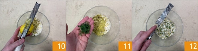 Ajoutez également le zeste de citron râpé 10, l'aneth 11, l'ail râpé 12 et l'huile.