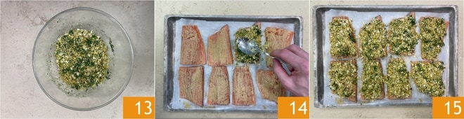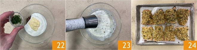 Mélangez pour amalgamer 13 et recouvrez les filets avec la panure 14, vous devez obtenir une épaisseur d'environ 1 cm 15. Assaisonnez avec un filet d'huile et faites cuire dans un four ventilé préchauffé à 190° pendant 12-13 minutes (le temps peut varier en fonction de l'épaisseur du filet).