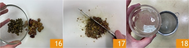 Pendant ce temps, préparez la sauce : hachez les câpres et les olives 16 17 et mettez-les dans un bol. Égouttez l'échalote 18.