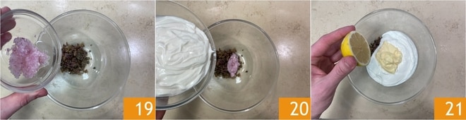 Versez-la dans le bol 19 avec le yaourt 20, la mayonnaise et le jus de citron 21.