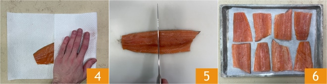 Épongez-les avec du papier absorbant 4, puis divisez-les en deux 5 et placez-les sur une plaque recouverte de papier sulfurisé 6.