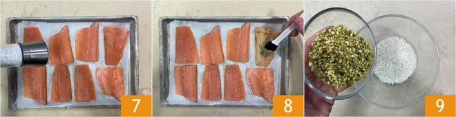 Salez 7 et badigeonnez-les d'un peu de moutarde 8. Préparez la panure : dans un bol, versez le panko et les pistaches hachées 9.