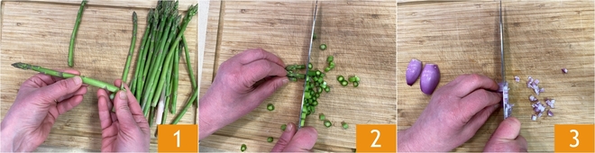 Pour préparer les tubetti crémeux aux petits pois, asperges et pecorino, commencez par Comment nettoyer les asperges : retirez la partie finale la plus dure de la tige 1 et coupez le reste en rondelles 2, en gardant les pointes légèrement plus longues. Épluchez l'échalote et hachez-la finement 3. Entre-temps, faites chauffer de l'eau ou du bouillon de légumes.