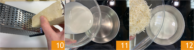Entre-temps, consacrez-vous à la fondue. Commencez par râper le pecorino 10. Dans une petite casserole, versez la crème fraîche 10 et ajoutez le pecorino râpé 12.