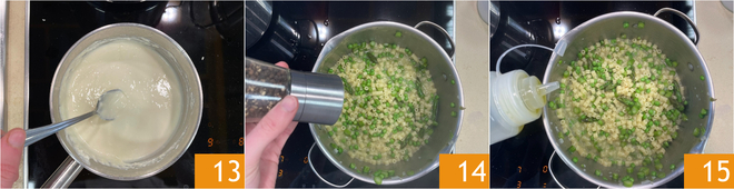 Laissez fondre à feu très doux 13, en remuant de temps en temps, jusqu'à obtenir une crème lisse et homogène. Lorsque les tubetti sont cuits et crémeux, éteignez le feu. Ajoutez une râpée de poivre noir 14 et mélangez-les avec un filet d'huile d'olive extra vierge 15.