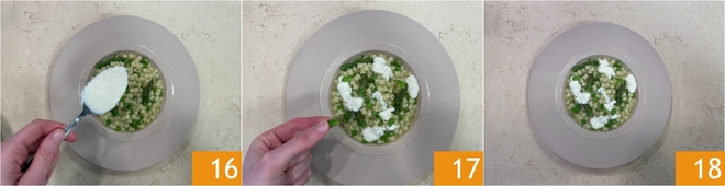 Dressez en répartissant les tubetti dans les assiettes, ajoutez par-dessus 1 à 2 cuillerées de fondue au pecorino 16 et terminez avec quelques feuilles de menthe fraîche 17. Servez immédiatement les tubetti crémeux aux asperges, petits pois et pecorino 18 !