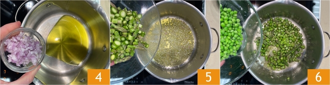 Dans une casserole, versez l'huile d'olive extra vierge, ajoutez l'échalote hachée 4 et laissez-la fondre à feu doux pendant 2 à 3 minutes, en remuant souvent pour éviter qu'elle ne colore. Ajoutez les asperges coupées 5 et les petits pois 6, puis laissez-les s'imprégner des saveurs pendant environ 5 à 6 minutes, en remuant de temps en temps.