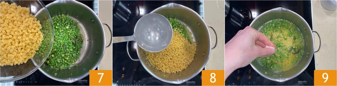 À ce stade, versez les tubetti directement dans la casserole 7 et ajoutez immédiatement une louche d'eau chaude 8. Poursuivez la cuisson comme pour un risotto : remuez fréquemment et ajoutez de l'eau chaude petit à petit, au fur et à mesure qu'elle est absorbée, jusqu'à ce que les pâtes soient cuites. Rectifiez l'assaisonnement en sel pendant la cuisson 9.
