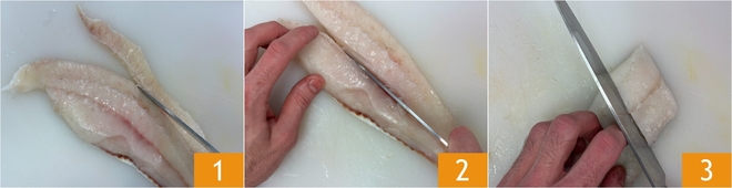 Pour préparer le turbot à la poêle avec salade d'oranges, radicchio et noix, commencez par nettoyer le poisson sans enlever la peau : retirez les arêtes latérales 1, puis divisez les filets en deux dans le sens de la longueur 2 et enfin coupez-les en losanges d'environ 5 cm 3.