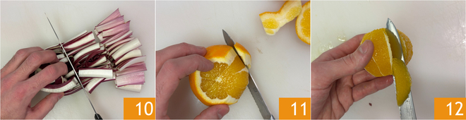Entre-temps, occupez-vous du contour : lavez et séchez le radicchio, éliminez la base et coupez-le en morceaux d'environ 3 cm de long 10. Épluchez les oranges à vif en enlevant à la fois la peau et la partie blanche 11, puis prélevez les quartiers en insérant la lame du couteau entre la pulpe et la membrane 12.