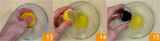 Mettez les quartiers de côté et pressez les restes de l'orange dans un bol pour obtenir environ 50 g de jus 13. Ajoutez également le jus de citron 14 et le vinaigre balsamique 15.
