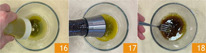 Ajoutez l'huile 16, le sel et le poivre 17. Mélangez énergiquement avec une fourchette pour créer une émulsion 18.